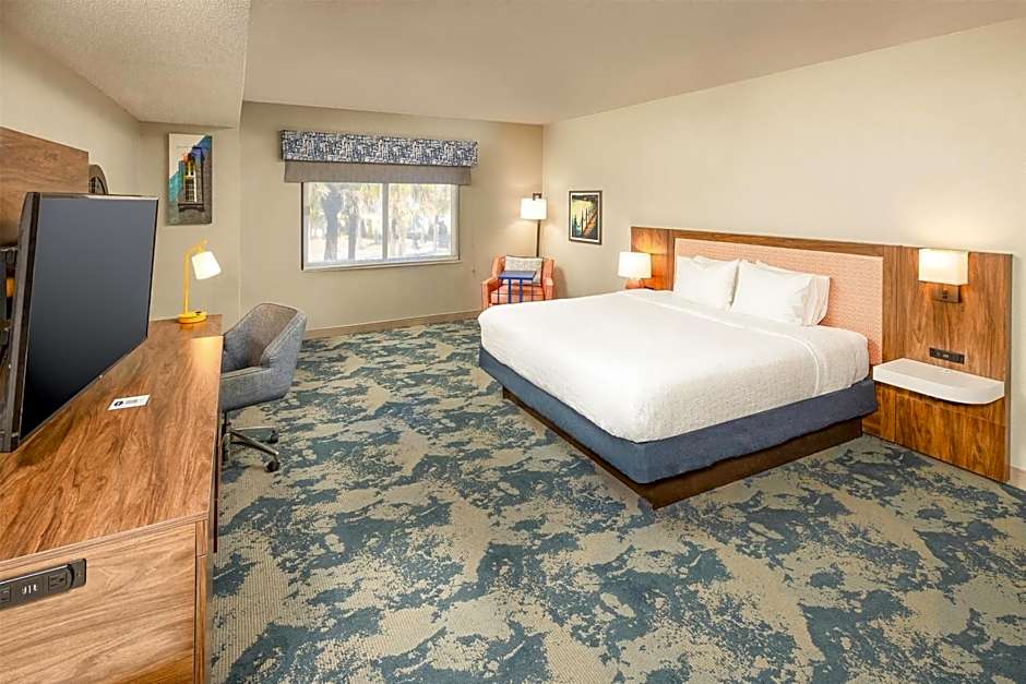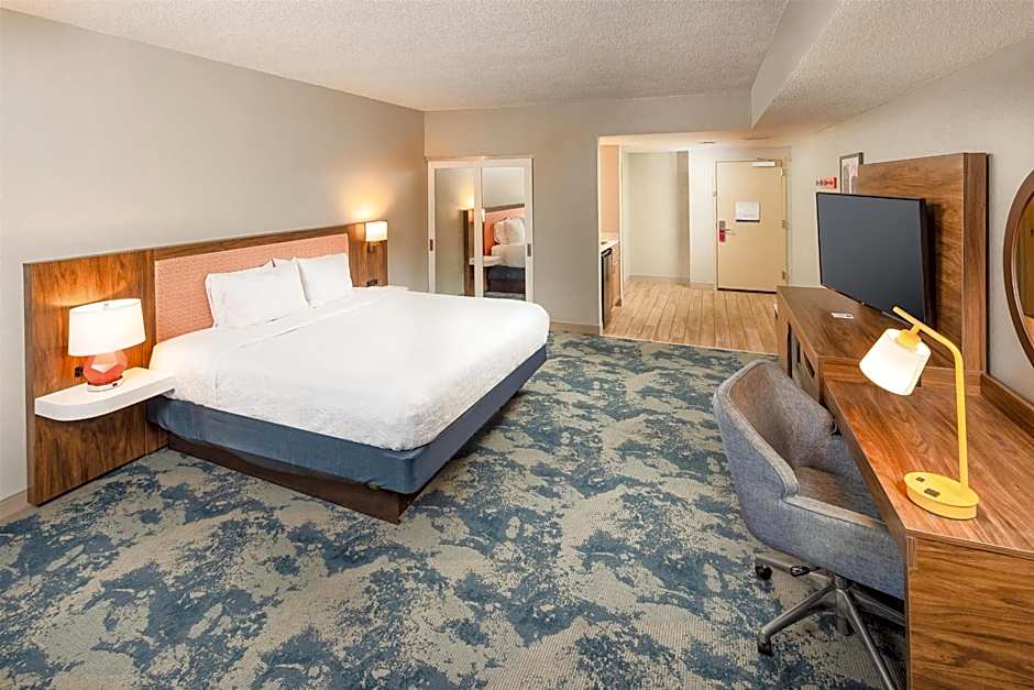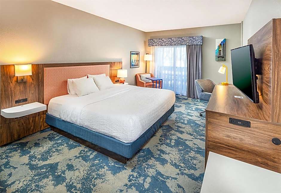 This room features a desk, flat-screen TV, and small refrigerator. A microwave is also included.
