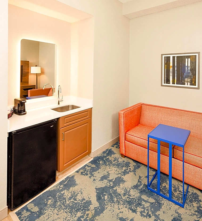 This room is hearing accessible and includes a visual alarm, microwave, and seating area.